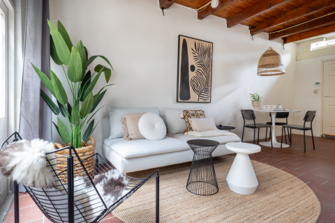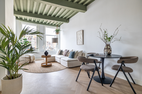 *Fijne, lichte woonkamer met balkenplafond. Op de 1e verdieping zijn de mooie kap met boogspanten in het zicht gehouden.